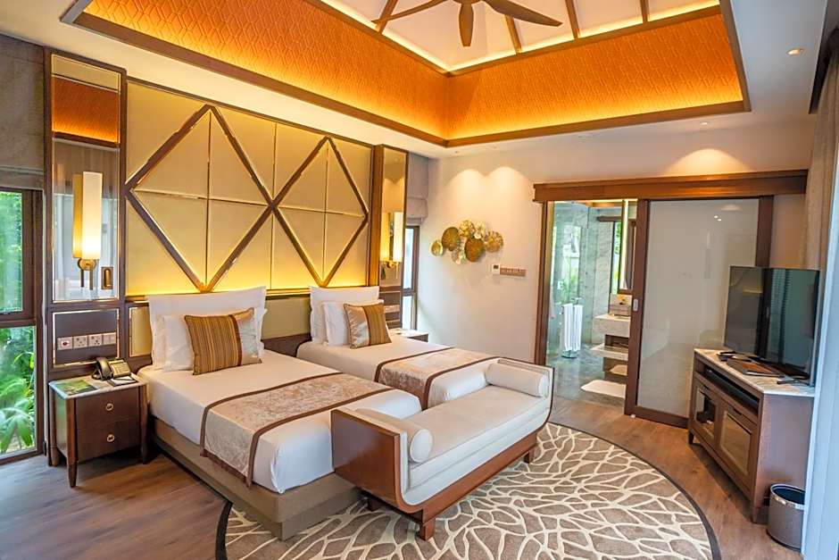 Unwind in a haven of natural luxury in our new Grand Garden Villas. With 260 square yards of bright, open-plan living space, these spectacular standalone residences set the scene for romantic retreats, family vacations, heavenly honeymoons and more. A large bedroom with premium bedding and a pillow menu is accompanied by an private bathroom with a soothing geothermal Jacuzzi, outdoor shower and private pool. Please note that children below 12 years of age cannot be accommodated in this room type.